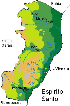 Espírito Santo (Portuguese: [(i)sˈpiɾitu ˈsɐ̃tu] ⓘ; lit. 'Holy Spirit') is a state in southeastern Brazil. Its capital is Vitória, and its largest city is Serra.[1] With an extensive coastline, the state hosts some of the country's main ports, and its beaches are significant tourist attractions.[5][6]