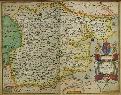 After the arrival of the Normans, the Forest of Essex was established as a royal forest, however, at that time, the term[22] was a legal term. There was a weak correlation between the area covered by the Forest of Essex (the large majority of the county) and the much smaller area covered by woodland. An analysis of Domesday returns for Essex has shown that the Forest of Essex was mostly farmland, and that the county as a whole was 20% wooded in 1086.[23] In 1218, Chelmsford became the county town.[24]