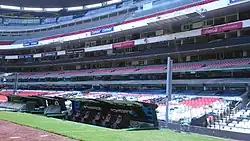 In February 2015, a vast renovation plan was unveiled with the intention that the completion of the project coincide with the stadium's 50th anniversary and with Club América's centenary in 2016, as well as the construction of a commercial hub outside the stadium to be completed some time in 2019. It was reported that Televisa, owners of the stadium, approved a joint-venture bid from private development firms IQ Real Estate and Alhel. The hub, named "Foro Azteca", would reportedly consist of a mall, office spaces, two hotels, new leisure spaces, and parking spaces for 2,500 cars.[1] The planned building of the hub was ultimately abandoned. The renovations to the stadium were planned in two phases: the first saw the demolition of the restaurant and seating at the lower east stand and the construction of a new hospitality area with dining and banqueting spaces, and the second saw the construction of new media boxes and private skyboxes at the upper west stand.[26][27] The renovations to the stadium were completed in November 2016, with the seating capacity ultimately reduced to 81,070.[28]