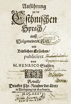 Estonian Grammar by Heinrich Stahl, published in Tallinn (Reval) in 1637