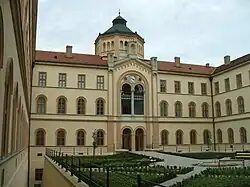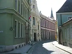 Surrounded by Baroque and Classicist buildings stands the Primate's Palace, designed by József Lippert (1880–82). The Keresztény Múzeum (Christian Museum), founded by Archbishop János Simor, is located in this building. It houses a rich collection of Hungarian panel pictures and sculpture of the Middle Ages as well as Italian and western-European paintings and handicrafts (13th-18th centuries). This is where one can admire the chapel-like structure of the late Gothic 'Úrkoporsó' (Lord's coffin) from Garamszentbenedek that is decorated by painted wooden sculptures (c. 1480), the winged altar-piece by Thomas of Coloswar (1427), paintings by Master M.S. (1506), the gothic altars from Upper Historical Hungary (Felvidék), handicrafts of Italian, German and Flemish artists from the 13th–17th centuries, tapestries and ceramics.
