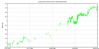 Halley gave an approximate apparent magnitude 4 at the time of discovery, which has been calculated as magnitude 3.3 on the modern scale. The handful of possible earlier sightings suggest that η Carinae was not significantly brighter than this for much of the 17th century.[2] Further sporadic observations over the next 70 years show that η Carinae was probably around 3rd magnitude or fainter, until Lacaille reliably recorded it at 2nd magnitude in 1751.[2] It is unclear whether η Carinae varied significantly in brightness over the next 50 years; there are occasional observations such as William Burchell's at 4th magnitude in 1815, but it is uncertain whether these are just re-recordings of earlier observations.[2]