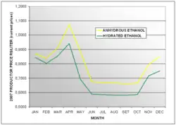 Ethanol production is concentrated in the Central and Southeast regions of the country, led by São Paulo state, with around 60% of the country's total ethanol production, followed by Paraná (8%), Minas Gerais (8%) and Goiás (5%).[87] These two regions have been responsible for 90% of Brazil's ethanol production since 2005[11][87] and the harvest season goes from April to November. The Northeast Region is responsible for the remaining 10% of ethanol production, led by Alagoas with 2% of total production.[87] The harvest season in the North-Northeast region goes from September to March, and the average productivity in this region is lower than the South-Central region.[88] Due to the difference in the two main harvest seasons, Brazilian statistics for sugar and ethanol production are commonly reported on a harvest two-year basis rather than on a calendar year.