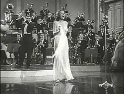 Merman returned to Broadway for another Porter musical, but despite the presence of Jimmy Durante and Bob Hope in the cast, Red, Hot and Blue closed after less than six months.[22] Back in Hollywood, Merman was featured in Happy Landing, one of the top-10 box-office hits of 1938 comedy with Sonja Henie, Cesar Romero, and Don Ameche. She also starred in the box-office hit Alexander's Ragtime Band, a pastiche of Irving Berlin songs interpolated into a plot that vaguely paralleled the composer's life, and Straight, Place and Show, a critical and commercial flop starring the Ritz Brothers.[23] She returned to the stage in Stars in Your Eyes, which closed short of four months as the public flocked to the 1939 New York World's Fair.[24] Merman followed this with two more Porter musicals. Du Barry Was a Lady, with Bert Lahr and Betty Grable, ran for a year,[25] and Panama Hattie, with Betty Hutton (whose musical numbers were cut from the show on opening night at Merman's insistence), June Allyson, and Arthur Treacher, fared even better, lasting slightly more than 14 months.[26]