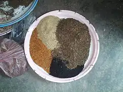 Berbere, a combination of powdered chili pepper and other spices (cardamom, fenugreek, coriander, cloves, ginger, nutmeg, cumin and allspice)[12] is an important ingredient used to add flavor to many varied dishes like chicken stews and baked fish dishes. Also essential is niter kibbeh, a clarified butter infused with ginger, garlic, and several spices.[13][14]