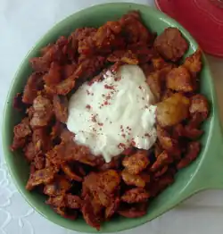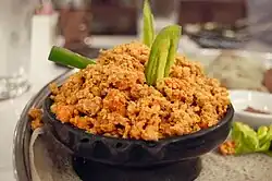 Ayibe (or ayeb) is a local cheese made from the curds of buttermilk that is mild and crumbly, close in texture to crumbled feta.[35][27] Although not quite pressed, the whey has been drained and squeezed out.[27] It is often served as a side dish to soften the effect of very spicy food. It has little to no distinct taste of its own. However, when served separately, ayibe is often mixed with a variety of mild or hot spices typical of Gurage cuisine.[36]