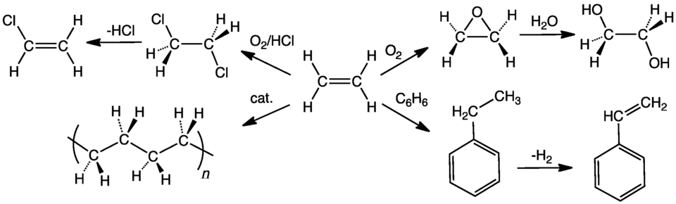 Major intermediates from the halogenation and hydrohalogenation of ethylene include ethylene dichloride, ethyl chloride, and ethylene dibromide. The addition of chlorine entails "oxychlorination", i.e. chlorine itself is not used. Some products derived from this group are polyvinyl chloride, trichloroethylene, perchloroethylene, methyl chloroform, polyvinylidene chloride and copolymers, and ethyl bromide.[17]