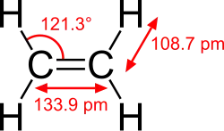 This hydrocarbon has four hydrogen atoms bound to a pair of carbon atoms that are connected by a double bond. All six atoms that comprise ethylene are coplanar. The H-C-H angle is 117.4°, close to the 120° for ideal sp² hybridized carbon. The molecule is also relatively weak: rotation about the C-C bond is a very low energy process that requires breaking the π-bond by supplying heat at 50 °C.