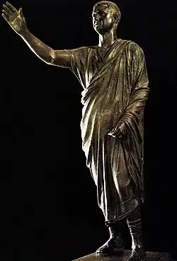 The Orator (c. 100 BC), an Etrusco-Roman bronze sculpture depicting Aule Metele (Latin: Aulus Metellus), an Etruscan man of Roman senatorial rank engaging in rhetoric, with detail of the Etruscan inscription