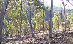 Australia is covered by 92,000,000 hectares (230,000,000 acres) of eucalypt forest, comprising three quarters of the area covered by native forest.[22] The Blue Mountains of southeastern Australia have been a centre of eucalypt diversification;[23] their name is in reference to the blue haze prevalent in the area, believed derived from the volatile terpenoids emitted by these trees.[24]