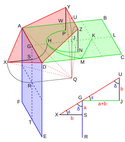 The final three books (11–13) primarily discuss solid geometry.[41] By introducing a list of 37 definitions, Book 11 contextualizes the next two.[58] Although its foundational character resembles Book 1, unlike the latter it features no axiomatic system or postulates.[58] The three sections of Book 11 include content on solid geometry (1–19), solid angles (20–23) and parallelepipedal solids (24–37).[58]