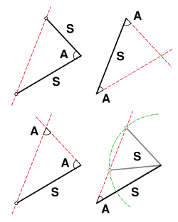 Congruence of triangles is determined by specifying two sides and the angle between them (SAS), two angles and the side between them (ASA) or two angles and a corresponding adjacent side (AAS). Specifying two sides and an adjacent angle (SSA), however, can yield two distinct possible triangles unless the angle specified is a right angle.