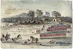 The location of the stockade has been described as "appalling from a defensive point of view", as it was situated on "a gentle slope, which exposed a sizeable portion of its interior to fire from nearby high ground".[101] A detachment of 800 men, which included "two field pieces and two howitzers" was under the commander in chief of the British forces in Australia, Major General Sir Robert Nickle. Nickle himself, who had seen action during the 1798 Irish rebellion, arrived after the insurgency had been put down.[102][103] In 1860, Withers stated in a lecture that "The site was most injudicious for any purpose of defence as it was easily commanded from adjacent spots, and the ease with which the place could be taken was apparent to the most unprofessional eye".[104]