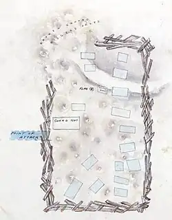 After the oath swearing ceremony, about 1,000 rebels marched in double file from Bakery Hill to the Eureka lead behind the Eureka Flag being carried by Henry Ross, where construction of the stockade took place between 30 November and 2 December.[89][90] There were existing mines within the stockade.[91] The stockade consisted of diagonal wooden spikes made from materials including pit props and overturned horse carts. It encompassed an area said to be one acre. Other estimates give the dimensions of the stockade as 100 feet (30 m) x 200 feet (61 m).[92] Contemporaneous descriptions and representations vary and have the stockade as either rectangular or semi-circular.[93]