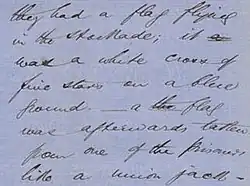 The Argus newspaper of 4 December 1854 reported that the Union Jack "had" to be hoisted underneath the Eureka Flag at the stockade and that both flags were in possession of the foot police.[109] Peter FitzSimons has questioned whether this contemporaneous report of the otherwise unaccounted-for Union Jack known as the Eureka Jack being present is accurate.[110] Among those willing to credit the first report of the battle as being true and correct it has been theorised that the hoisting of a Union Jack at the stockade was possibly an 11th-hour response to the divided loyalties among the heterogeneous rebel force which was in the process of dissipating.[111]