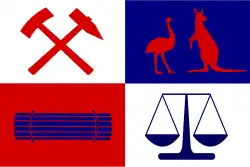 The design of the Digger's flag was along the same lines as the flag flown at Forrest Creek in 1851. It has four quarters that feature a pick, shovel and cradle, symbolising the mining industry; a bundle of sticks tied together, symbolising unity; the scales of justice, symbolising the remedies the miners sought; and a Kangaroo and Emu, symbolising Australia.[22]