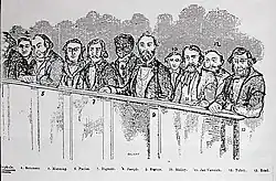 The James Scobie murder trial ended on 18 November 1854, with the accused, James Bentley, Thomas Farrell and William Hance, being convicted of manslaughter and sentenced to three years of hard labour on a road crew.[73] Catherine Bentley was acquitted. Two days later, the miners Westerby, Fletcher and McIntyre were convicted for burning the Eureka Hotel and were sentenced to jail terms of six, four and three months.[73]