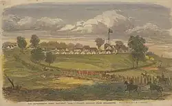 On 20 August 1853, just as an angry mob of 500–600 miners went to assemble outside the government camp at Waranga, the authorities used a legal technicality to release some mining tax evaders.[32] A meeting in Beechworth called for reducing the licence fee to ten shillings and voting rights for the mining settlements.[32] A larger rally attended by 20,000 people was held at Hospital Hill in Bendigo on 23 August 1853, which resolved to support a mining tariff fixed at 10 shillings a month.[35][36]