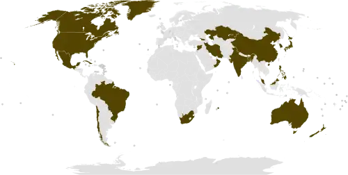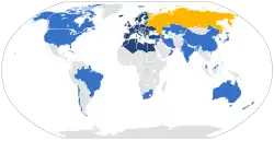 ![]() Countries with one or more members are in dark blue. Associated members in light blue. Suspended members in yellow. | |