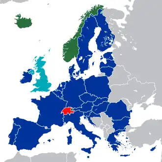 The European Economic Area (EEA) was established via the Agreement on the European Economic Area,[3] an international agreement which enables the extension of the European Union's single market to member states of the European Free Trade Association (EFTA).[4] The EEA links the EU member states and three of the four EFTA states (Iceland, Liechtenstein, and Norway) into an internal market governed by the same EU laws. These rules aim to enable free movement of persons, goods, services, and capital within the European single market, including the freedom to choose residence in any country within this area. The EEA was established on 1 January 1994 upon entry into force of the EEA Agreement. The contracting parties are the EU, its member states, and Iceland, Liechtenstein, and Norway.[3] New members of EFTA would not automatically become party to the EEA Agreement, as each EFTA State decides on its own whether it applies to be party to the EEA Agreement or not. According to Article 128 of the EEA Agreement, "any European State becoming a member of the Community shall, and the Swiss Confederation or any European State becoming a member of EFTA may, apply to become a party to this Agreement. It shall address its application to the EEA Council." EFTA does not envisage political integration. It does not issue legislation, nor does it establish a customs union. Schengen is not a part of the EEA Agreement. However, all of the four EFTA States participate in Schengen and Dublin through bilateral agreements. They all apply the provisions of the relevant acquis.