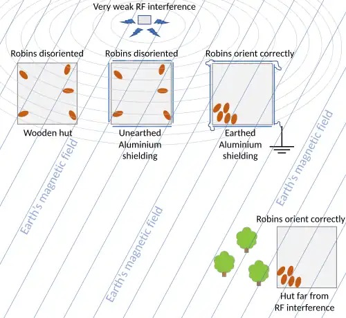 The avian magnetic compass of the robin has been extensively researched and uses vision-based magnetoreception, in which the robin's ability to sense the magnetic field of the Earth for navigation is affected by the light entering the bird's eye. The physical mechanism of the robin's magnetic sense involves quantum entanglement of electron spins in cryptochrome in the bird's eyes.[46][45]