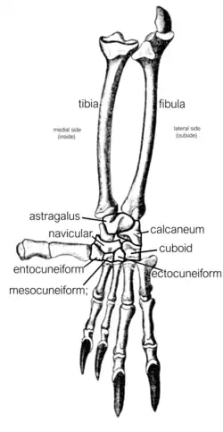 - the joint between the first metatarsal bone and the entocuneiform bone (the innermost of the three cuneiform bones) in the foot is offset farther back than the joint between the second metatarsal and middle cuneiform bones—in metatherians these joints are level with each other[10]