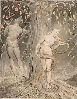 Eve is found in the Genesis 3 expulsion from Eden narrative which is characterized as a parable or "wisdom tale" in the wisdom tradition.[20] This narrative portion is attributed to Yahwist (J) by the documentary hypothesis due to the use of YHWH.[21] In the narrative of humanity’s expulsion from Eden, a dialogue occurs between the woman and a serpent possessing legs (3:1–5).[22] This serpent is described in 2:19 as one of the animals formed by Yahweh among the beasts of the field.[23] The woman is willing to talk to the serpent and respond to the creature's cynicism by repeating Yahweh's prohibition from 2:17.[24] The serpent directly disputes Yahweh's command.[25] The woman eats from the fruit of the forbidden tree and also gives to the man who is with her and he eats. (3:6–8).[26] Yahweh questions Adam, who blames the woman (3:9–13).[22] Yahweh then challenges the woman to explain herself, who blames the serpent, who is cursed to crawl on its belly, so losing its limbs.[27] Divine pronouncement of three judgments are then laid against all culprits (3:14–19).[22] A judgement oracle and the nature of the crime is first laid upon the serpent, then the woman, and finally Adam. After the serpent is cursed by Yahweh,[28] the woman receives a penalty that impacts two primary roles: childbearing and her subservient relationship to her husband,[29] though the woman's desire in Genesis 3:16 is written in Septuagint as 'αποστροφή' which means 'turning away from', 'disgust', or 'repugnance', and this shows that man might be metaphorically likened to sin, considering that the terms 'turn away' and 'rule' are used in the verse.[30] Adam's penalty then follows, that man has to toil and till the ground to eat his food.[31][32] It is also speculated that this is the first mention of vegetables, though it is implied as "plants of the field". The final judgement is then laid, the one punishment suffered by all mankind, that man shall perish.[33] The reaction of Adam, the naming of Eve, and Yahweh making skin garments are described in a concise narrative (3:20–21). The garden account ends with an Elohim conversation, determining the couple's expulsion, and the execution of that deliberation (3:22–24).[22]