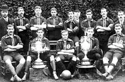 The club was a founding member of the Football League in 1888–89 and won their first League Championship title in the 1890–91 season. The 1890–91 season started in superb form with five straight victories, with Fred Geary scoring in each of the first six matches.[9] By mid-January, Everton had completed all but one of their fixtures and were on 29 points, while Preston North End were eleven points adrift with seven games still to play. Everton than had to sit out the next two months as Preston completed their fixture list until they were only two points adrift with one match each left to play. Both teams played their final games of the season on 14 March, with Everton losing 3–2 at Burnley (Geary scored both Everton goals) and Preston going down 3–0 at Sunderland.[10] Everton were thus able to win the Football League Championship for the first time, by a margin of two points with fourteen victories from their 22 league games. Geary had been ever-present, and was the club's top goal-scorer with 21 goals.