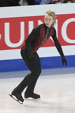 Evgeni Viktorovich Plushenko[1] (Russian: Евгений Викторович Плющенко, born 3 November 1982)[2] is a Russian former figure skater. He is a four-time Olympic medalist (2006 gold, 2014 team gold, 2002 & 2010 silver), a three-time World champion (2001, 2003, 2004), a seven-time European champion (2000, 2001, 2003, 2005, 2006, 2010, 2012), a four-time Grand Prix Final champion (1999–2000, 2000–01, 2002–03, 2004–05), and a ten-time Russian national champion (1999–2002, 2004–2006, 2010, 2012–2013). Plushenko's four Olympic medals once tied with Sweden's Gillis Grafström's record for most Olympic medals in figure skating, which has since been surpassed by Scott Moir and Tessa Virtue.[3][4] He also won a record total of 22 titles on the Grand Prix circuit.