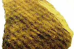 The zosterophylls were already important in the late Silurian, much earlier than any rhyniophytes of comparable complexity.[66] This group, recognisable by their kidney-shaped sporangia which grew on short lateral branches close to the main axes, sometimes branched in a distinctive H-shape.[1] Many zosterophylls bore enations (small tissue outgrowths on the surface with variable morphologies) on their axes but none of these had a vascular trace. The first evidence of vascularised enations occurs in a fossil clubmoss known as Baragwanathia that had already appeared in the fossil record in the Late Silurian.[67] In this organism, these leaf traces continue into the leaf to form their mid-vein.[68] One theory, the "enation theory", holds that the microphyllous leaves of clubmosses developed by outgrowths of the protostele connecting with existing enations[1] The leaves of the Rhynie genus Asteroxylon, which was preserved in the Rhynie chert almost 20 million years later than Baragwanathia, had a primitive vascular supply – in the form of leaf traces departing from the central protostele towards each individual "leaf".[69] Asteroxylon and Baragwanathia are widely regarded as primitive lycopods,[1] a group still extant today, represented by the quillworts, the spikemosses and the club mosses. Lycopods bear distinctive microphylls, defined as leaves with a single vascular trace. Microphylls could grow to some size, those of Lepidodendrales reaching over a meter in length, but almost all just bear the one vascular bundle. An exception is the rare branching in some Selaginella species.