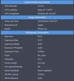 • Camera settings: This includes static information such as the camera model and make, and information that varies with each image such as orientation (rotation), aperture, shutter speed, focal length, metering mode, and ISO speed information