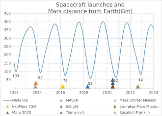 Spacecraft launches and Mars distance from Earth in millions of kilometers