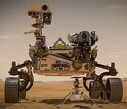 There are two functional rovers on the surface of Mars, the Curiosity and Perseverance rovers, both operated by the American space agency NASA. Perseverance was accompanied by the Ingenuity helicopter, which scouted sites for Perseverance to study before the helicopter's mission ended in 2024.[4] The Zhurong rover, part of the Tianwen-1 mission by the China National Space Administration (CNSA)[5][6] was active until 20 May 2022 when it went into hibernation due to approaching sandstorms and Martian winter; the rover was expected to wake up from hibernation in December 2022, but as of April 2023 it has not moved and is presumed to be permanently inactive.[7]