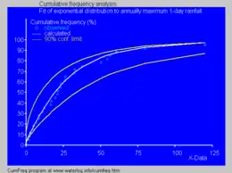 - The blue picture illustrates an example of fitting the exponential distribution to ranked annually maximum one-day rainfalls showing also the 90% confidence belt based on the binomial distribution. The rainfall data are represented by plotting positions as part of the cumulative frequency analysis.