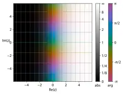 A complex plot of , with the argument represented by varying hue. The transition from dark to light colors shows that is increasing only to the right. The periodic horizontal bands corresponding to the same hue indicate that is periodic in the imaginary part of .