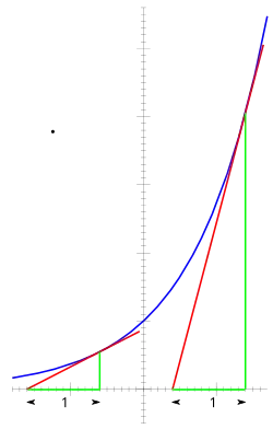 The graph of is upward-sloping, and increases faster than every power of .[3] The graph always lies above the x-axis, but becomes arbitrarily close to it for large negative x; thus, the x-axis is a horizontal asymptote. The equation means that the slope of the tangent to the graph at each point is equal to its height (its y-coordinate) at that point.
