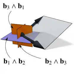 For vectors in , the exterior algebra is closely related to the cross product and triple product. Using the standard basis , the exterior product of a pair of vectors and is where is the natural basis for the three-dimensional space . The coefficients above are the same as those in the usual definition of the cross product of vectors in three dimensions, the only difference being that the exterior product is not an ordinary vector, but instead is a bivector.