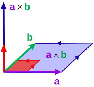 The cross product (blue vector) in relation to the exterior product (light blue parallelogram). The length of the cross product is to the length of the parallel unit vector (red) as the size of the exterior product is to the size of the reference parallelogram (light red).