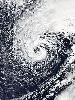 The most intense extratropical cyclone across the North Pacific Ocean occurred in November 2014, when a cyclone partially related to Typhoon Nuri reached a record low pressure of 920 mbar (27 inHg).[62][63] In October 2021, the most intense Pacific Northwest windstorm occurred off the coast of Oregon, peaking with a pressure of 942 mbar (27.8 inHg).[64] One of the strongest nor'easters occurred in January 2018, in which a cyclone reached a pressure of 950 mbar (28 inHg).[65]