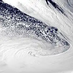The wind flow around an extratropical cyclone is counterclockwise in the northern hemisphere, and clockwise in the southern hemisphere, due to the Coriolis effect (this manner of rotation is generally referred to as cyclonic). Near this center, the pressure gradient force (from the pressure at the center of the cyclone compared to the pressure outside the cyclone) and the Coriolis force must be in an approximate balance for the cyclone to avoid collapsing in on itself as a result of the difference in pressure.[31] The central pressure of the cyclone will lower with increasing maturity, while outside of the cyclone, the sea-level pressure is about average. In most extratropical cyclones, the part of the cold front ahead of the cyclone will develop into a warm front, giving the frontal zone (as drawn on surface weather maps) a wave-like shape. Due to their appearance on satellite images, extratropical cyclones can also be referred to as frontal waves early in their life cycle. In the United States, an old name for such a system is "warm wave".[32]