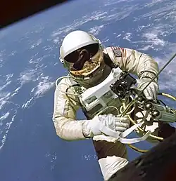 The first American spacewalk was performed on June 3, 1965, by Ed White from the second crewed Gemini flight, Gemini IV, for 21 minutes. White was tethered to the spacecraft, and his oxygen was supplied through a 25-foot (7.6 m) umbilical, which also carried communications and biomedical instrumentation. He was the first to control his motion in space with a Hand-Held Maneuvering Unit, which worked well but only carried enough propellant for 20 seconds. White found his tether useful for limiting his distance from the spacecraft but difficult to use for moving around, contrary to Leonov's claim.[6] However, a defect in the capsule's hatch latching mechanism caused difficulties opening and closing the hatch, which delayed the start of the EVA and put White and his crewmate at risk of not getting back to Earth alive.[8]
