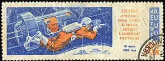 The first spacewalk, made by Soviet cosmonaut Alexei Leonov, was commemorated in 1965 with several Eastern Bloc stamps (see Alexei Leonov#Stamps). Since the Soviet Union did not publish details of the Voskhod spacecraft at the time, the spaceship depiction in the stamps was purely fictional.