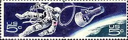 The U.S. Post Office issued a postage stamp in 1967 commemorating Ed White's first American spacewalk. The engraved image has an accurate depiction of the Gemini IV spacecraft and White's space suit.[31]