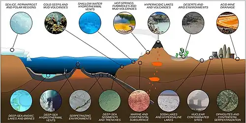 1. ^ a b c Merino, Nancy; Aronson, Heidi S.; Bojanova, Diana P.; Feyhl-Buska, Jayme; Wong, Michael L.; Zhang, Shu; Giovannelli, Donato (2019). "Living at the Extremes: Extremophiles and the Limits of Life in a Planetary Context". Frontiers in Microbiology. 10 780. Bibcode:2019FrMic..10..780M. doi:10.3389/fmicb.2019.00780. PMC 6476344. PMID 31037068. S2CID 115205576.
