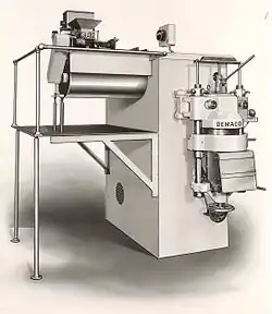 In 1797, Joseph Bramah patented the first extrusion process for making pipe out of soft metals. It involved preheating the metal and then forcing it through a die via a hand-driven plunger.[2] In 1820 Thomas Burr implemented that process for lead pipe, with a hydraulic press (also invented by Joseph Bramah). At that time the process was called "squirting". In 1894, Alexander Dick expanded the extrusion process to copper and brass alloys.[3] Harder materials like steel started being extruded in 1951, while titanium extrusion was developed during the 1960s and 1970s.[4][5]