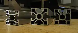 Extruded aluminum with several hollow cavities; T slots allow bars to be joined with special connectors.