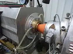 In 1950, Ugine Séjournet, of France, invented a process which uses glass as a lubricant for extruding steel.[25] The Ugine-Sejournet, or Sejournet, process is now used for other materials that have melting temperatures higher than steel or that require a narrow range of temperatures to extrude, such as the platinum-iridium alloy used to make kilogram mass standards.[26] The process starts by heating the materials to the extruding temperature and then rolling it in glass powder. The glass melts and forms a thin film, 20 to 30 mils (0.5 to 0.75 mm), in order to separate it from chamber walls and allow it to act as a lubricant. A thick solid glass ring that is 0.25 to 0.75 in (6 to 18 mm) thick is placed in the chamber on the die to lubricate the extrusion as it is forced through the die. A second advantage of this glass ring is its ability to insulate the heat of the billet from the die. The extrusion will have a 1 mil thick layer of glass, which can be easily removed once it cools.[7]