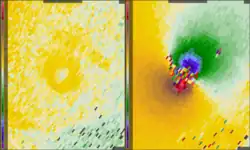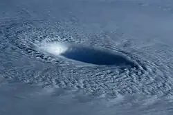 Eyewall mesovortices are small scale rotational features found in the eyewalls of intense tropical cyclones. They are similar, in principle, to small "suction vortices" often observed in multiple-vortex tornadoes.[19] In these vortices, wind speeds may be greater than anywhere else in the eyewall.[20] Eyewall mesovortices are most common during periods of intensification in tropical cyclones.[19]