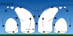 Eyewall mesovortices often exhibit unusual behavior in tropical cyclones. They usually revolve around the low pressure center, but sometimes they remain stationary. Eyewall mesovortices have even been documented to cross the eye of a storm. These phenomena have been documented observationally,[21] experimentally,[19] and theoretically.[22]