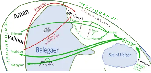 Arda in the First Age. The Elves migrated across Middle-earth; many of them travelled to Valinor (green arrows to the left). Finwë's killing by Melkor led in turn to the Flight of the Noldor (red arrows to the right) back to Beleriand in Middle-earth.